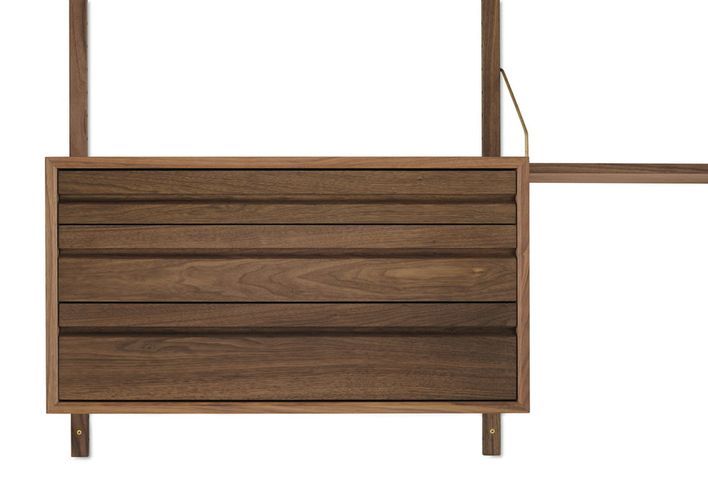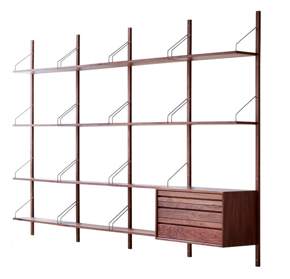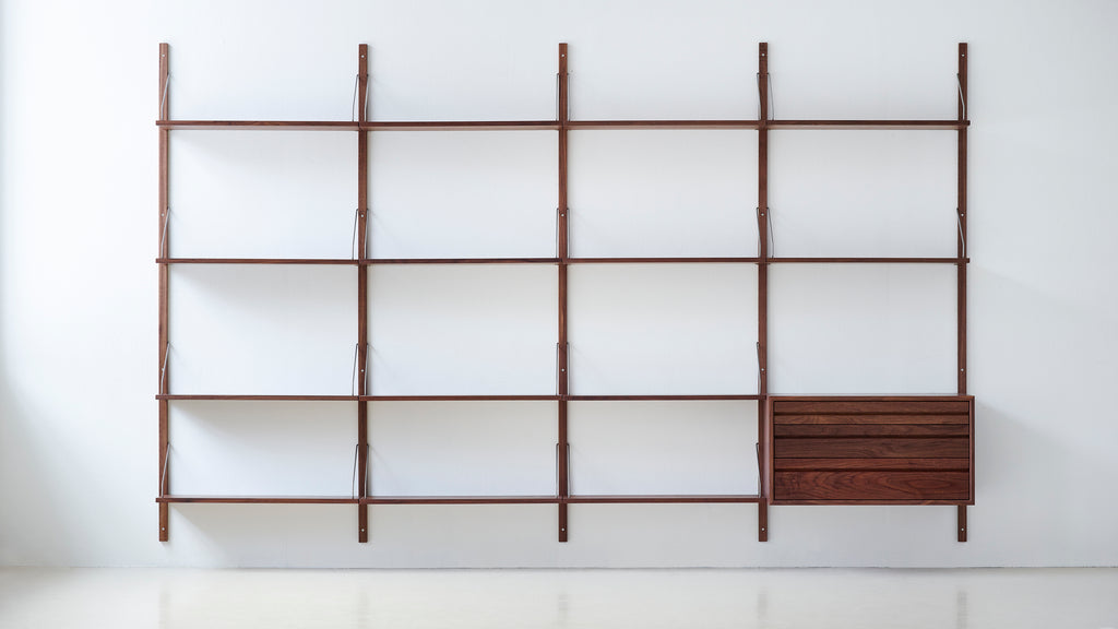 Wandsysteem gemaakt van geolied eikenhout, oorspronkelijk ontworpen door Poul Cadovius en opnieuw geproduceerd door dk3. Dit modulaire systeem bestaat uit 14 boekenplanken, 1 ladekast en 5 rails.