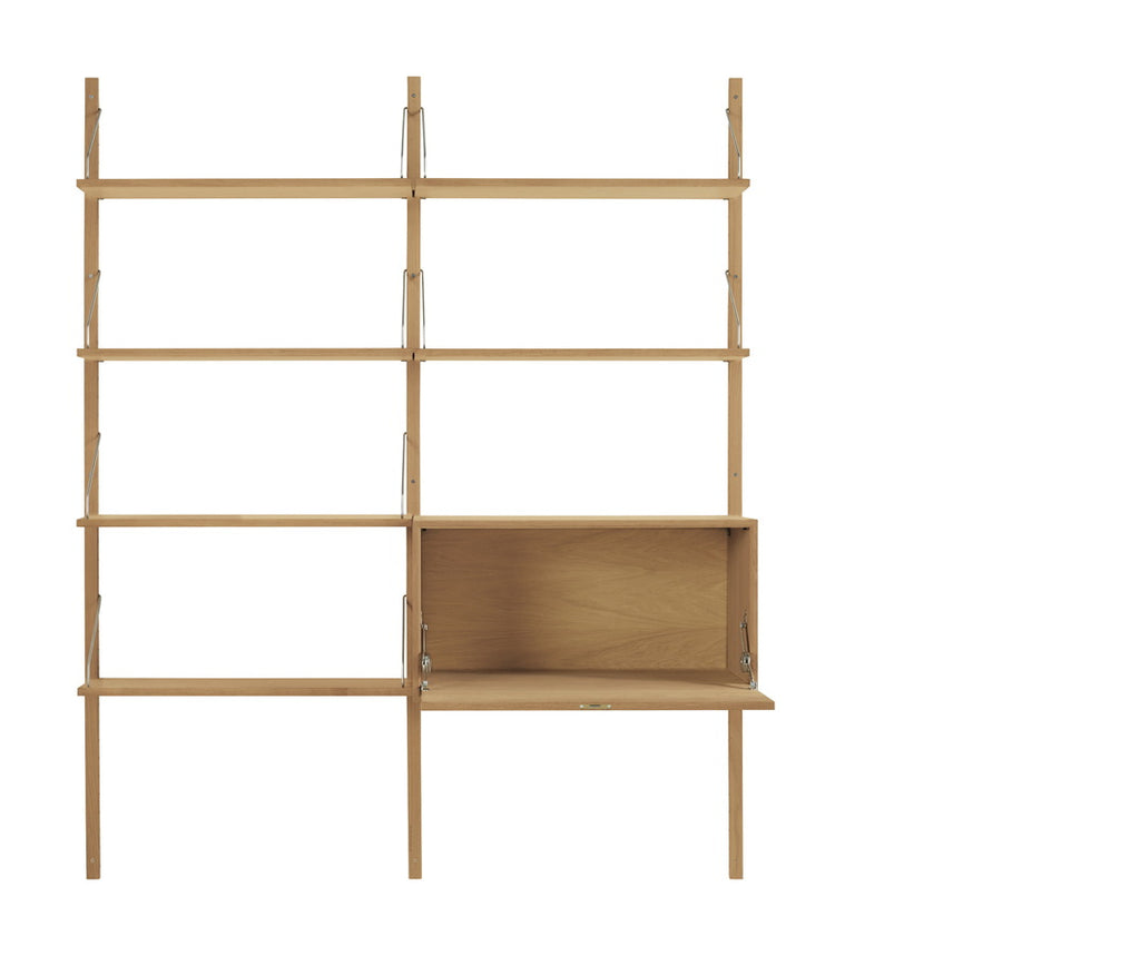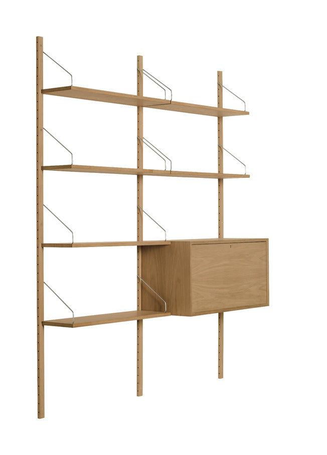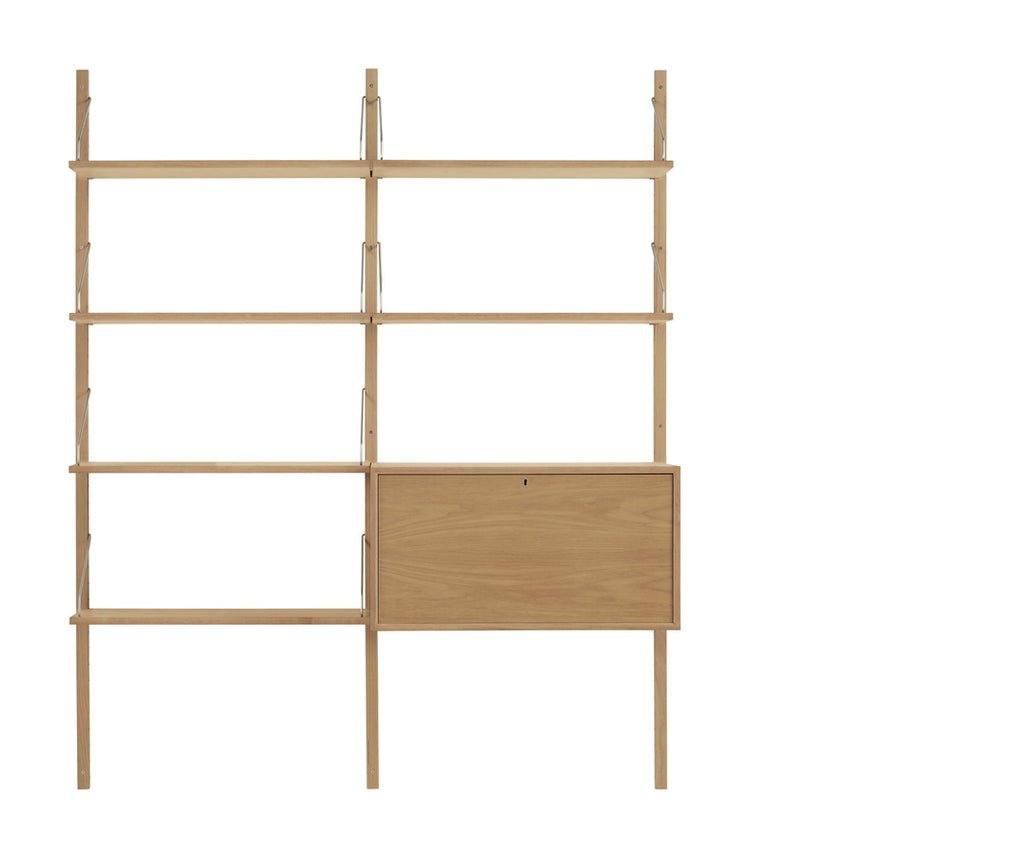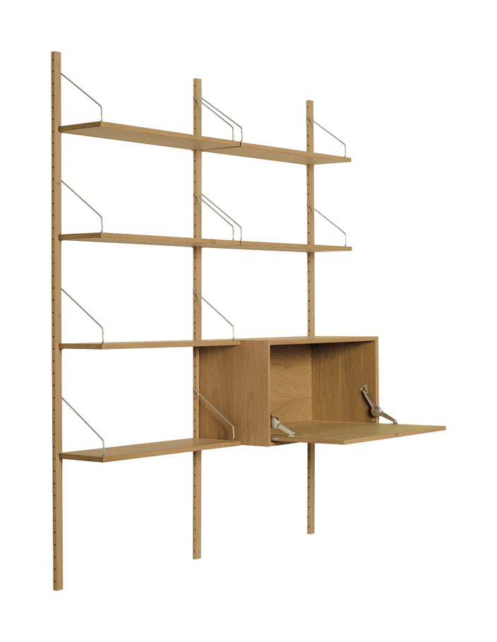 Wandsysteem gemaakt van geolied eikenhout, oorspronkelijk ontworpen door Poul Cadovius en opnieuw geproduceerd door dk3. Dit modulaire systeem bestaat uit 6 boekenplanken, 1 kasten en 3 rails.