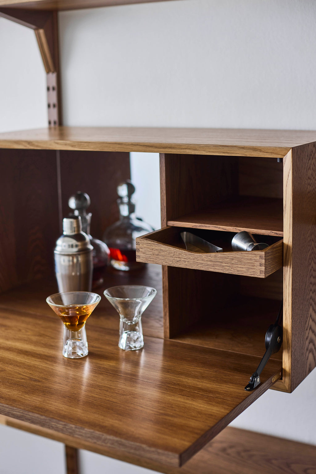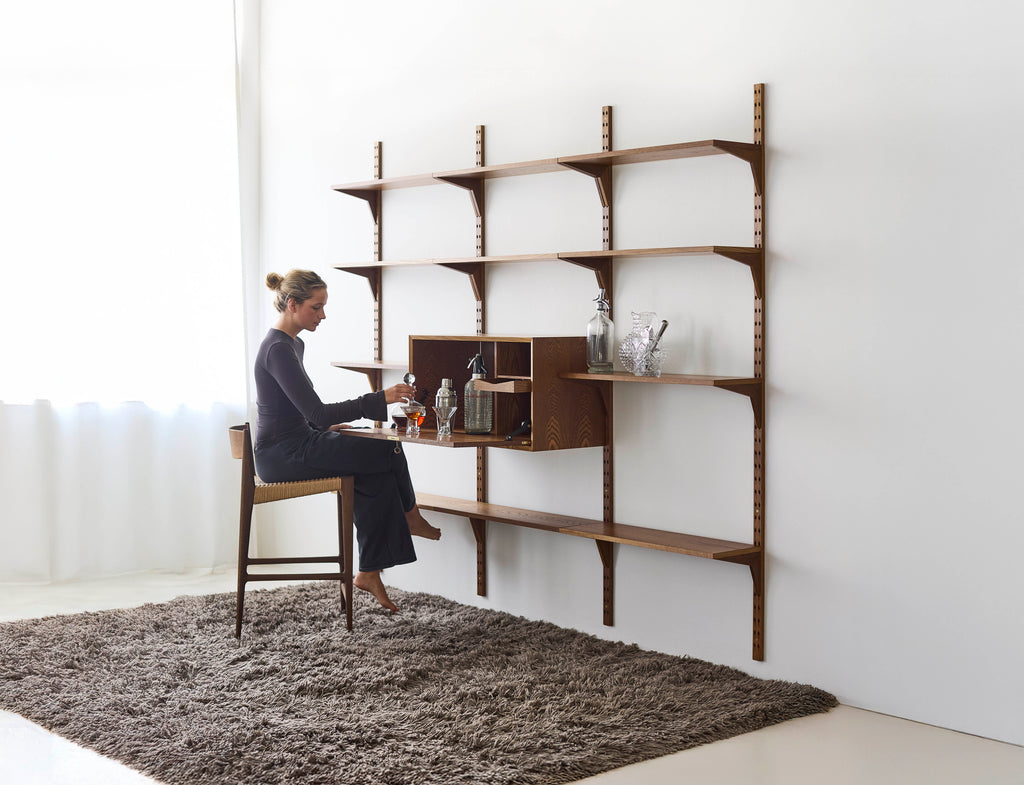 System Cado is verkrijgbaar in Eiken, gerookt Eiken, zwart gelakt Eiken en Walnoot. Het systeem op de foto is gemaakt van gerookt Eiken en oorspronkelijk ontworpen door Poul Cadovius, opnieuw geproduceerd door dk3.