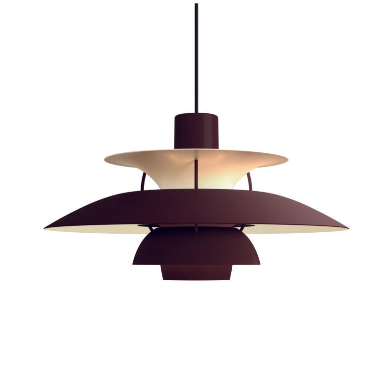 De pendel straalt schitteringsvrij, naar beneden gericht licht uit en verlicht ook zijn eigen frame, wat een zacht, prettig schijnsel oplevert vanuit het midden van de pendel. Poul Henningsen ontwierp de PH5 in 1958 als reactie op de vele veranderingen die lampenproducenten aanbrachten in de vorm en grootte van gloeilampen in die tijd, wat volgens Henningsen volkomen zinloos was. In de PH5 konden allerlei soorten lichtbronnen worden gebruikt, die allemaal een prettig licht opleverden. Hierdoor werd de PH 5 zo beroemd dat deze synoniem werd voor 'het PH-licht' dat vandaag de dag nog steeds de meest eigentijdse interieurs naar een hoger niveau tilt. Henningsen had een eigen, wetenschappelijke benadering van licht en ontwierp talrijke armaturen op basis van het meerschermensysteem dat hij in 1925 uitvond voor hoogwaardige, schitteringsvrije verlichting. Met de logaritmische spiraal als basis wist hij een gelijkmatige verdeling van het licht te bewerkstelligen via het meerschermensysteem, dat het mogelijk maakte om schittering en schaduwwerking tegen te gaan. De nummers van de PH-lampen verwijzen naar de omvang van de schermen. De PH5 heeft een bovenscherm van ongeveer 50 cm in doorsnede.